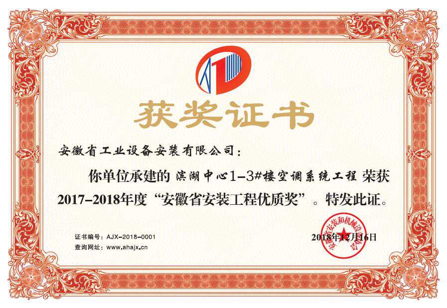 根據(jù)《中國安裝工程優(yōu)質(zhì)獎(jiǎng)(中國安裝之星)評(píng)選辦法》(安協(xié)〔2015〕19號(hào))、《關(guān)于開展“2017-2018 年度中國安裝工程優(yōu)質(zhì)獎(jiǎng)(中國安裝之星)第一批評(píng)選活動(dòng)”的通知》(安協(xié)〔2017〕7 號(hào))要求,協(xié)會(huì)做為我省推薦單位,組織專家對(duì)七個(gè)申報(bào)中國安裝工程優(yōu)質(zhì)獎(jiǎng)項(xiàng)目,進(jìn)行檢查驗(yàn)收,一致認(rèn)為,均代表我省安裝行業(yè)優(yōu)質(zhì)水平。為表彰先進(jìn),樹立標(biāo)桿,經(jīng)研究決定授予安徽省工業(yè)設(shè)備安裝有限公司“濱湖中心1-3#樓空調(diào)系統(tǒng)工程”等七項(xiàng)工程榮獲2017-2018年度“安徽省安裝工程優(yōu)質(zhì)獎(jiǎng)”。并在協(xié)會(huì)第七屆三次理事(擴(kuò)大)會(huì)議上通報(bào)表彰。協(xié)會(huì)希望各獲獎(jiǎng)單位珍惜榮譽(yù),再接再厲,繼續(xù)探索爭(zhēng)先創(chuàng)優(yōu)的經(jīng)驗(yàn),充分發(fā)揮示范引領(lǐng)作用,各協(xié)會(huì)會(huì)員單位要以獲獎(jiǎng)單位為榜樣,牢固樹立質(zhì)量第一意識(shí),多出精品,多創(chuàng)名品,為質(zhì)量強(qiáng)省,提質(zhì)優(yōu)效,轉(zhuǎn)型升級(jí)發(fā)展而努力。