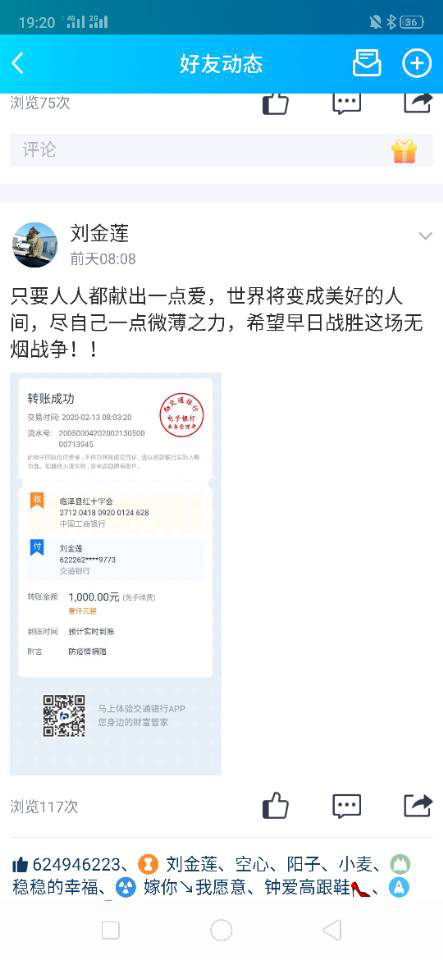 2020年2月13日,劉金蓮?fù)就ㄟ^(guò)微信轉(zhuǎn)賬的方式轉(zhuǎn)給甘肅省臨澤縣紅十字會(huì)捐款人民幣1000元,然后她又主動(dòng)聯(lián)系當(dāng)?shù)丶t十字會(huì)工作人員要求擔(dān)當(dāng)志愿者,但是因?yàn)榭陀^(guān)原因未被批準(zhǔn)。