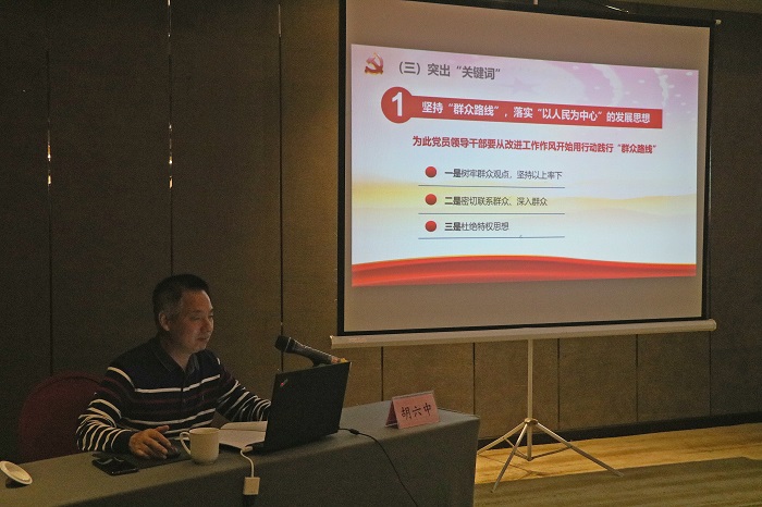 胡六中在報告中帶領(lǐng)大家共同回顧了習近平總書記考察安徽行程路線和重要講話精神,他指出,總書記在考察中多次提到“要牢固樹立以人民為中心的發(fā)展思想”“要踐行黨的宗旨,樹牢群眾觀點”“要多謀民生之利、多解民生之憂”,全體黨員領(lǐng)導干部一要從改進工作作風開始用行動踐行“群眾路線”,落實“以人民為中心”的發(fā)展思想;二要堅持“黨管干部”,全面深化干部制度改革;三要堅持“一體化”和“高質(zhì)量”,推動黨建與生產(chǎn)經(jīng)營深度融合。