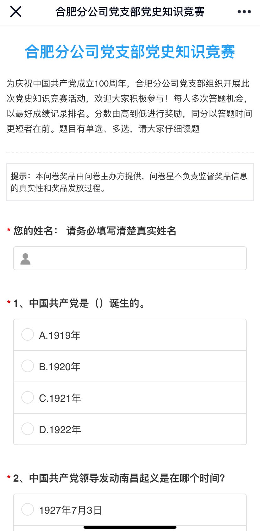 為慶祝中國共產(chǎn)黨成立100周年,持續(xù)推進(jìn)黨史學(xué)習(xí)教育,引導(dǎo)分公司黨員干部學(xué)史明理、學(xué)史增信、學(xué)史崇德、學(xué)史力行,營造“知史愛黨、知史愛國”的良好氛圍,4月26日-27日,合肥分公司黨支部組織開展了黨史學(xué)習(xí)教育知識競賽活動。