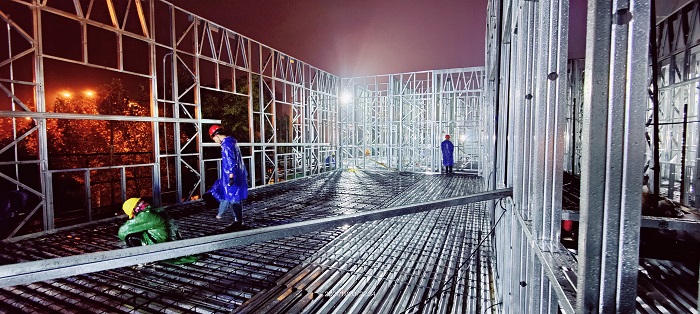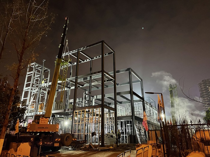 自11月初接到項目任務(wù)以來,面對一個月完成三層結(jié)構(gòu)方艙醫(yī)院主體機構(gòu)、內(nèi)部安裝、室外裝飾的極限工期,安徽安裝公司高度重視、精心組織、科學(xué)安排、迎難而上,全力以赴加快工程建設(shè),期間,公司領(lǐng)導(dǎo)多次前往項目現(xiàn)場幫助協(xié)調(diào)解決工程施工中的難點、困難,為項目人員鼓勁加油;公司相關(guān)部門負責(zé)人駐扎項目一線,指導(dǎo)協(xié)調(diào)內(nèi)部流程、現(xiàn)場施工、外部對接、質(zhì)量安全等一應(yīng)事務(wù);分公司第一時間組織精干力量進入項目現(xiàn)場,梳理現(xiàn)場情況,核對圖紙清單,進行施工準備。從公司領(lǐng)導(dǎo)到項目一線,安徽安裝公司自上而下以高度的使命感和責(zé)任感,投入到緊張的工程建設(shè)中去。項目管理人員披星戴月,從早上到夜間駐守在項目一線,每日召開工程會議,討論施工工作進展,制定下一步工作計劃,安排交叉作業(yè)工序。為保障夜間施工安全,項目部安排兩名安全員輪流值守項目現(xiàn)場,夜間在項目現(xiàn)場不斷巡查確保施工安全、高效開展。